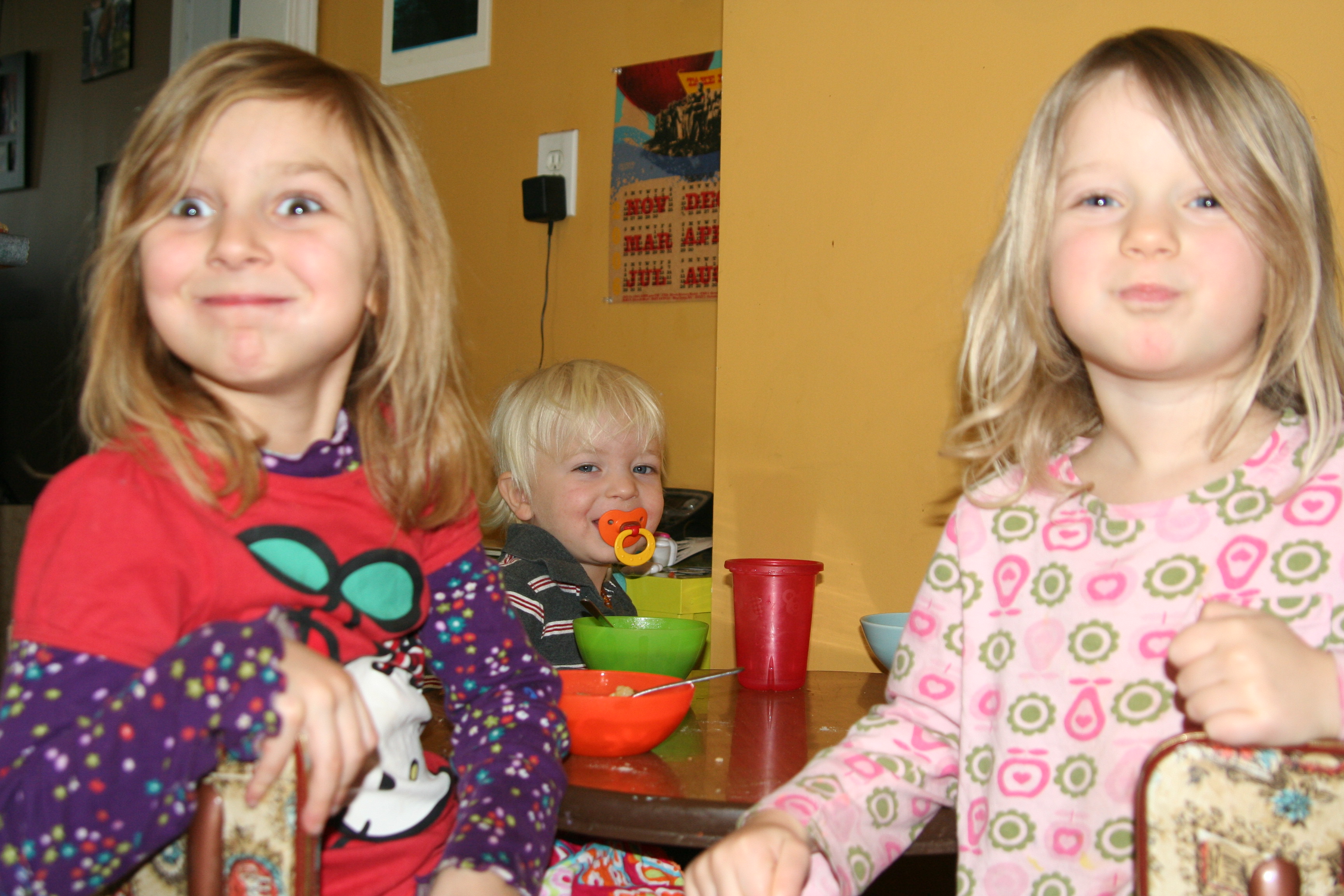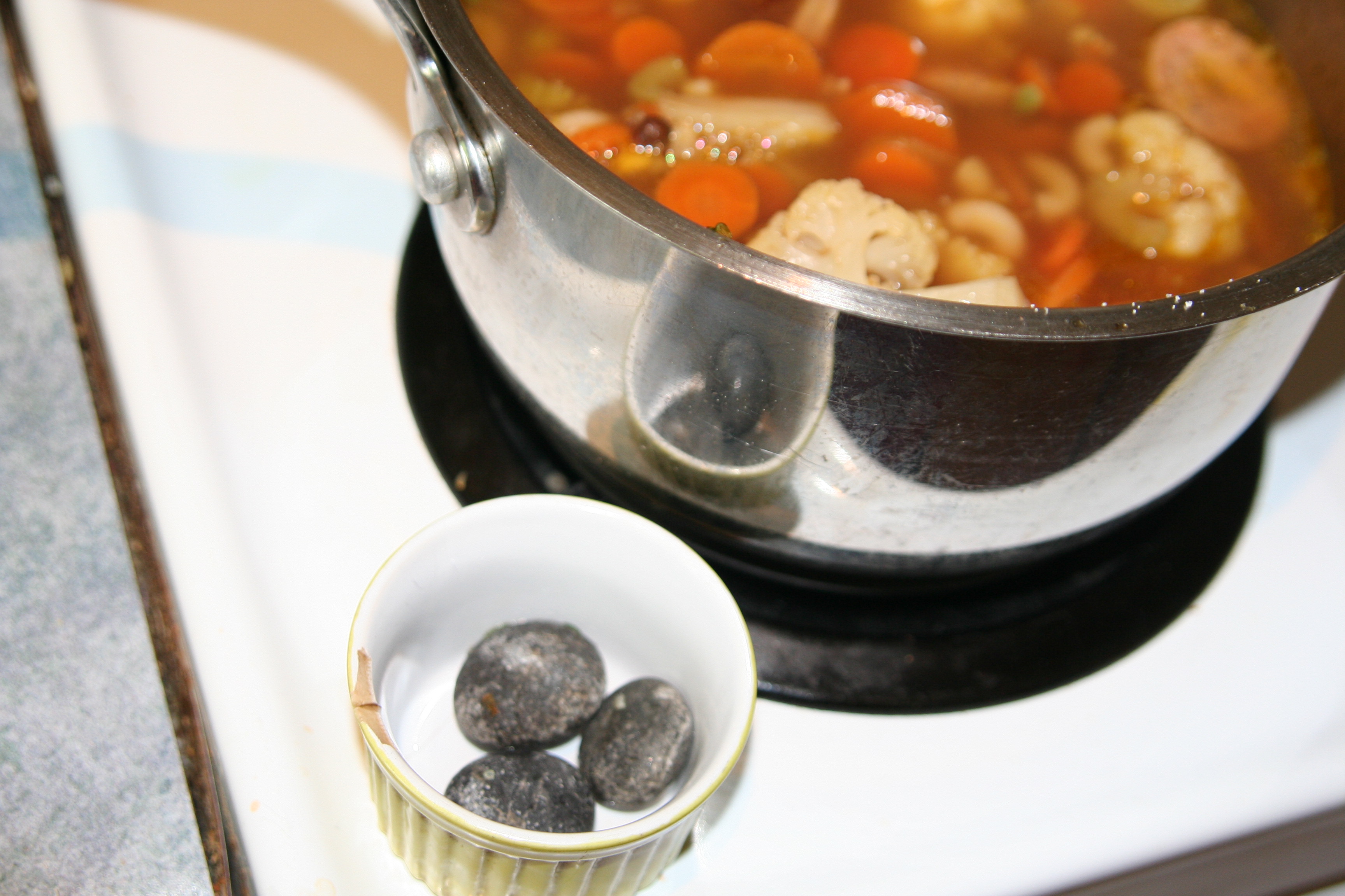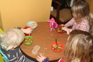 Sometimes when I have the extra two kids, I like to do theme days. They’re fun for me to plan, because I can incorporate the meals, books, activities and crafts or experiments. Today was Soup Day! There wasn’t a lot to it, but it was fun. First, we read Stone Soup, by Ann McGovern (my copy is from the 70s or 80s and is well loved). It’s about a traveler who stops at an old woman’s house to beg for some food, only she says she has none. He says it’s fine, he has a stone that he can use to make soup. They throw it in a pot with some water and boil it, and he keeps suggesting she add more ingredients (chicken, carrots, onions, beef bones, barley) and of course they end up with delicious soup.